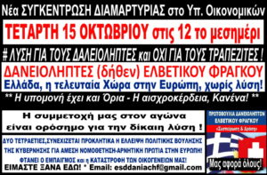 Η Επιτροπή Πρωτοβουλίας Δανειοληπτών Ελβετικού Φράγκου, σας ενημερώνει ότι την Τετάρτη 15 Οκτώβρη στις 12 το μεσημέρι διοργανώνει την 15η συγκέντρωση-διαμαρτυρία στο Υπουργείο Οικονομικών Νίκης 5 – Σύνταγμα.